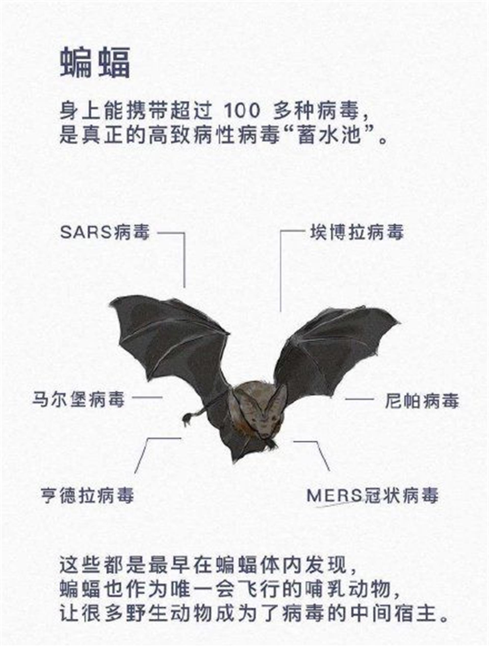 相对来说蝙蝠体内的病菌就相当致命了,因为蝙蝠也是哺乳动物。只需要一点小小的变异,就可以传播到其它野生动物,在经由野味市场传播到人群中来。